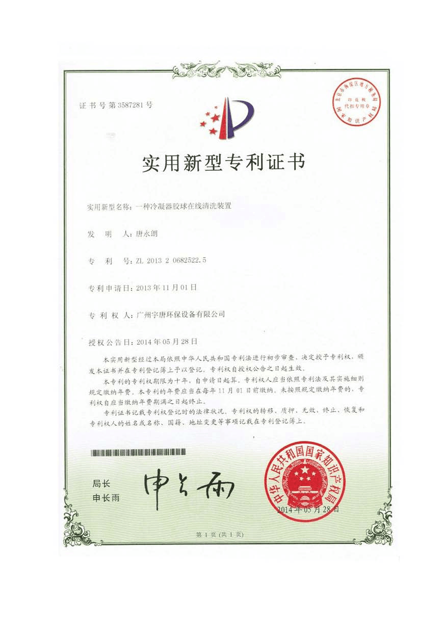 一种冷凝器胶球在线清洗装置实用新型专利证书
